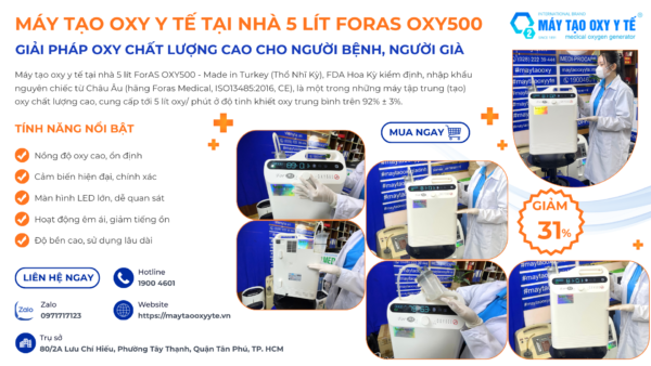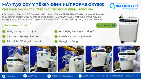 Máy tạo oxy y tế, gia đình, tại nhà, cho người bệnh, người già, 5 lít Foras OXY500 là giải pháp oxy tinh khiết chuẩn y tế quốc tế, kết hợp công nghệ hiện đại, độ bền cao, vận hành êm ái và tính di động linh hoạt. Sản phẩm này xứng đáng là trợ thủ đắc lực giúp Quý khách hàng chăm sóc sức khỏe an toàn, tiện lợi và hiệu quả lâu dài.